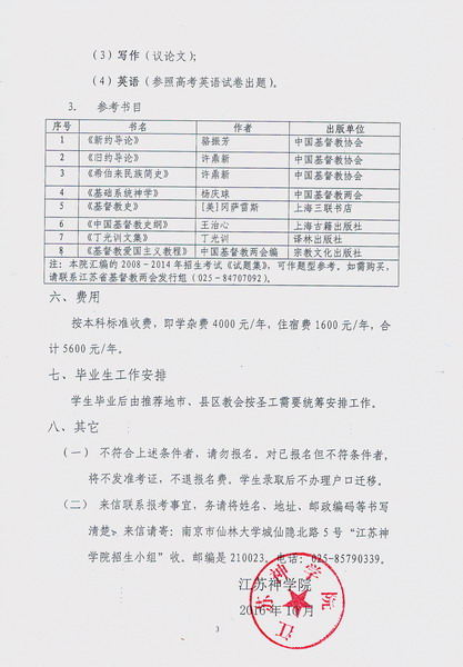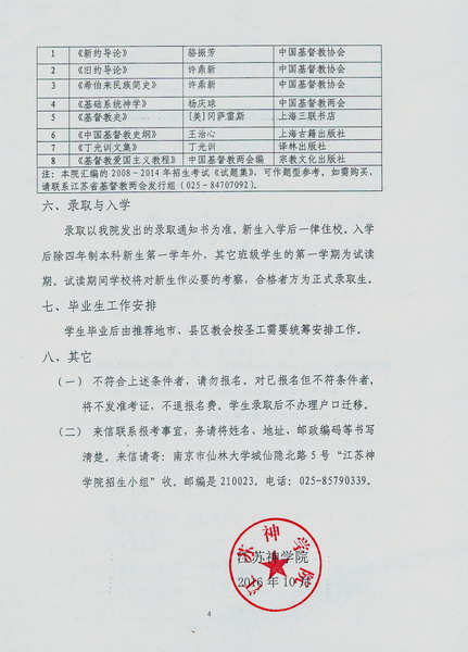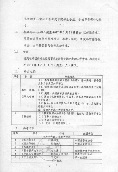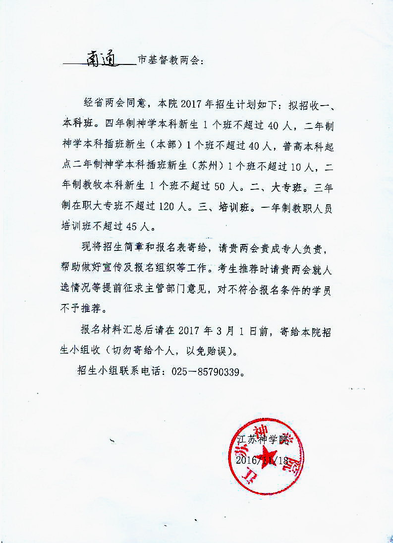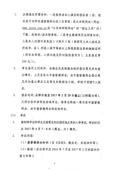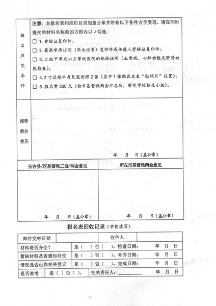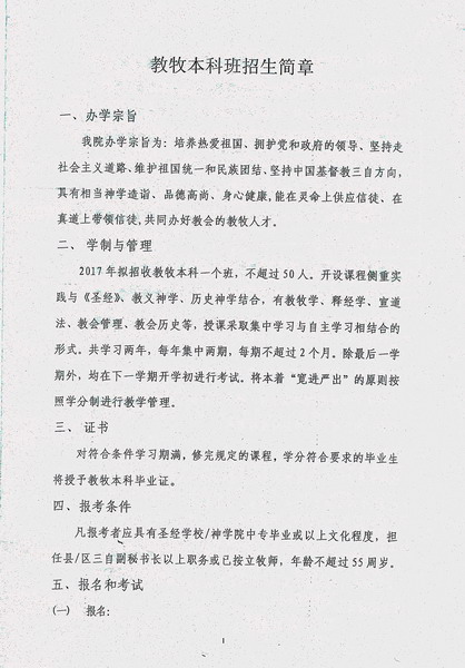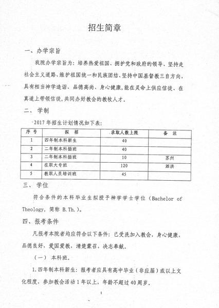 培养热爱祖国,拥护党和政府的领导,坚持走社会主义道路、维护祖国统一和名族团结、坚持中国基督教三自方向,具有相当神学造诣、品德高尚、身心健康,能在灵命上供应信徒、在真道上带领信徒,共同办好教会的教牧人才。经省两会同意,本院2017年招生计划如下: