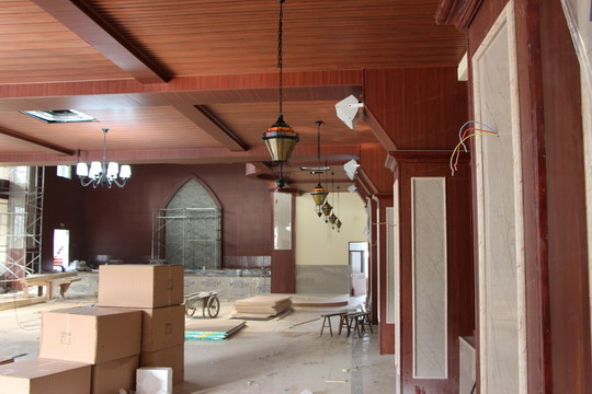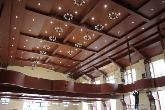 今天天气很好,我又特别又看了看施工现场。屋顶的铝板防护工程正在收尾,这个新顶特别加上了防火保温层,给人有非常的安全感;大堂外立面的亮化工程和已经完工,并已经入调试阶段,其中就包括了更换一个崭新的LED在大堂的塔楼上,一到晚上打开的时候那银白色的光可以引导第一城基督教堂周围人们脚下的路;大堂周围的亮化工程也已一起安装到位,当全新的路灯一打开的时候,大堂的四周全被照得通量;整个教堂消防安全设施已经全部安装就位并可以确保正常使用;大堂二楼东侧的钢化玻璃雨棚撑起了一个大空间,可以遮阳避雨;大堂的外墙用真石漆喷涂过,很有质感;穿过气派的正门,就进到装修整齐的大堂内部,啊真是太美了,一下子让人惊得不敢说话……