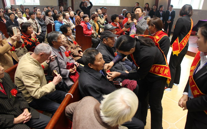 2017年10月29日上午,南通第一城基督教堂举办敬老节礼拜。根据敬老活动方案,年满70周岁的弟兄姊妹在礼拜前佩戴大红花,坐在教堂的前十排。其中第一排的老人,在崇拜中获得佩戴大红花礼仪。参加本次敬老活动,并佩戴大红花的弟兄姊妹近300人。为了确保活动有条不紊进行,后期保障部的弟兄姊妹作了精心策划,让老人们在教会中感受到在基督里面的大爱与尊重。